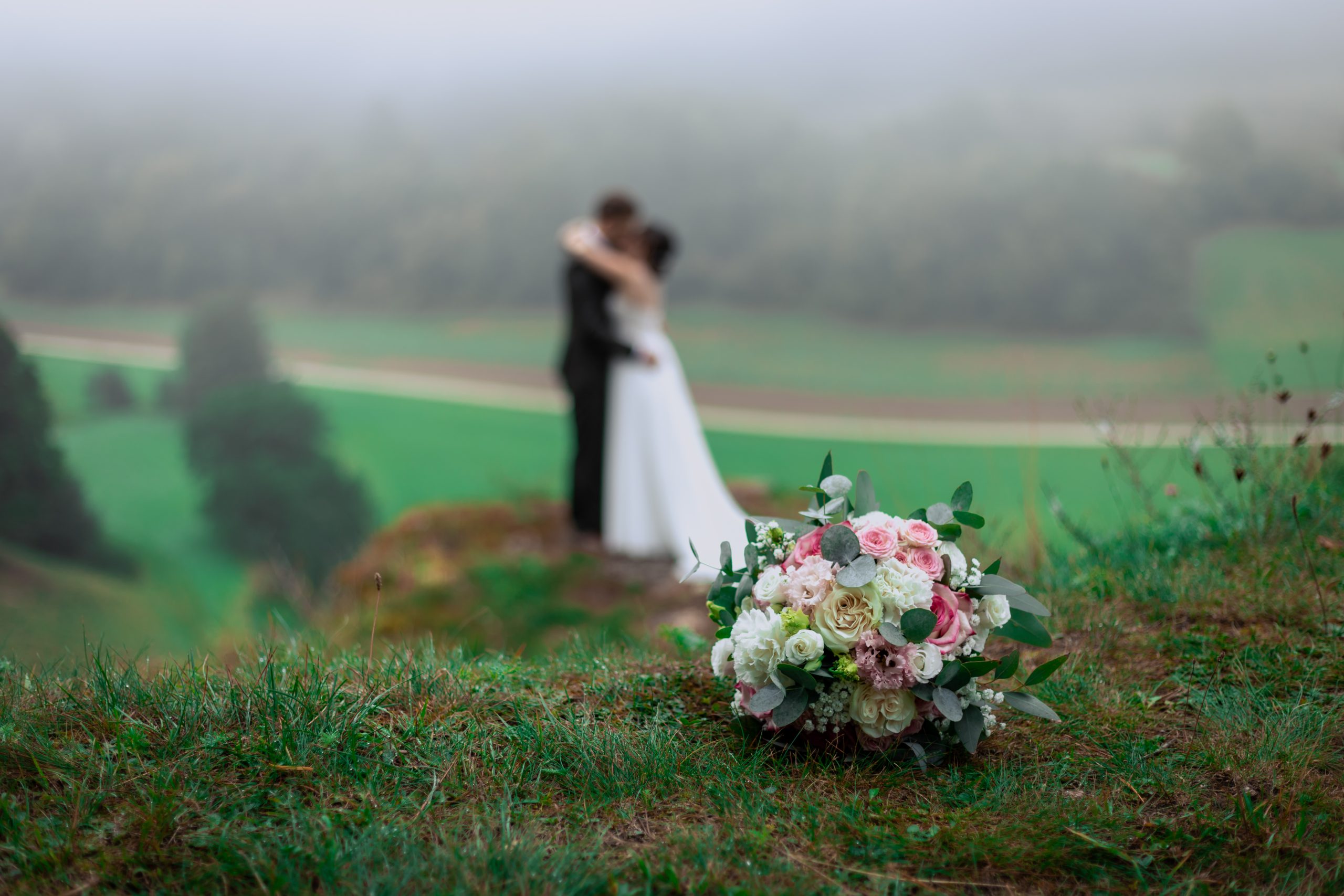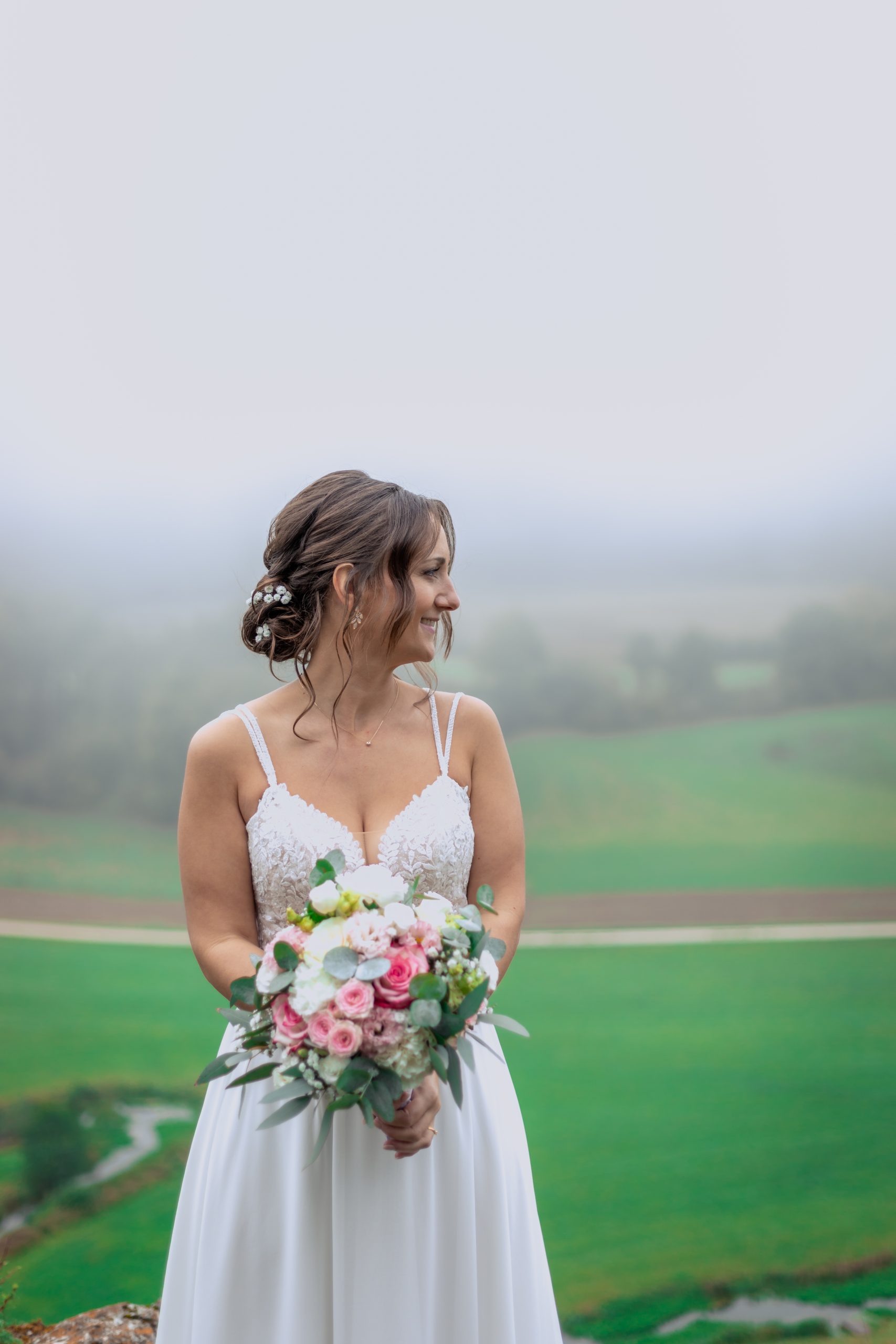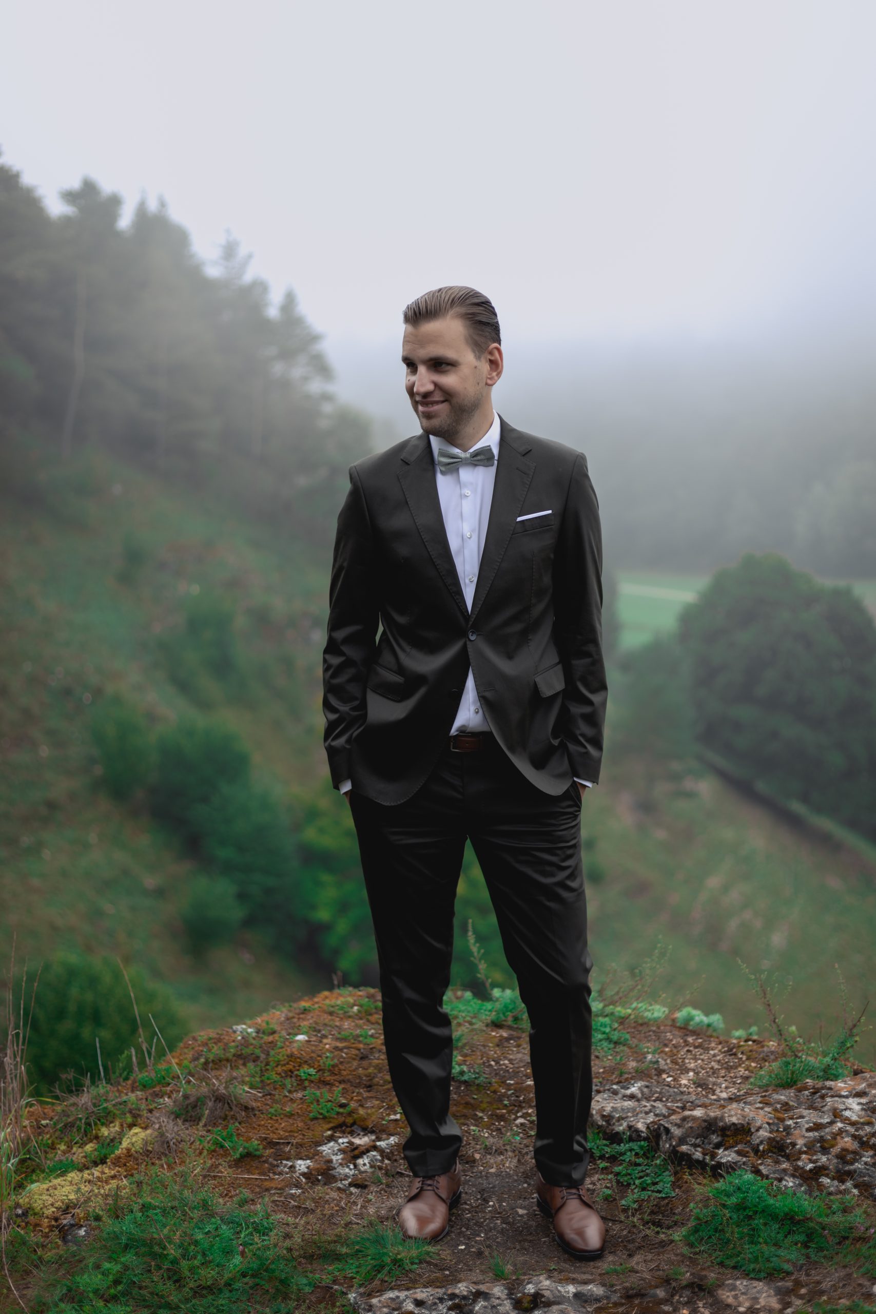 Wir fotografierten an einem Ort mit einer atemberaubenden Aussicht, die im sanften Nebel fast wie gemalt wirkte. Die Landschaft öffnete sich nur schemenhaft, und gerade dadurch entstand eine Atmosphäre voller Ruhe, Intimität und zeitloser Schönheit. Jeder Blick, jede Berührung und jedes Lächeln der beiden wirkte noch intensiver – als würde der Herbst selbst die Bühne für ihre Liebe bereiten.